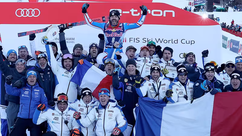 Wie der Franzose im ORF-Interview nach der Siegerehrung am Fuße des Hahnenkamms erzählt, ist das Interieur seines Hotelzimmers bei einer teaminternen Feier der französischen Mannschaft nicht ganz heil geblieben.