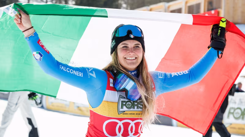 Die Italienerin feiert beim Weltcup-Finale in Kvitfjell ihren dritten Abfahrtssieg in Folge und schnappt sich damit ihre erste Kristallkugel.